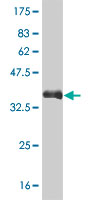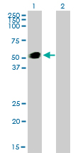 Western Blot analysis of GATA2 expression in transfected 293T cell line by GATA2 monoclonal antibody (M01), clone 2D11.Lane 1: GATA2 transfected lysate(50.5 KDa).Lane 2: Non-transfected lysate. |