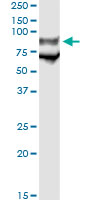 Immunoprecipitation of GP1BA transfected lysate using anti-GP1BA monoclonal antibody and Protein A Magnetic Bead (<a href="products_detail.asp?Catalog_id=U0007">U0007</a>), and immunoblotted with GP1BA MaxPab rabbit polyclonal antibody.
