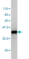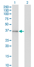 Western Blot analysis of GPS2 expression in transfected 293T cell line by GPS2 monoclonal antibody (M01), clone 3C4.Lane 1: GPS2 transfected lysate (Predicted MW: 36.7 KDa).Lane 2: Non-transfected lysate.