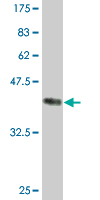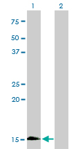 Western Blot analysis of HBZ expression in transfected 293T cell line by HBZ monoclonal antibody (M01), clone 3C4-1D5.Lane 1: HBZ transfected lysate(15.6 KDa).Lane 2: Non-transfected lysate. |