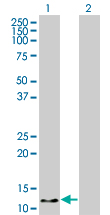Western Blot analysis of HBZ expression in transfected 293T cell line by HBZ monoclonal antibody (M03), clone 1G10.Lane 1: HBZ transfected lysate(15.6 KDa).Lane 2: Non-transfected lysate.