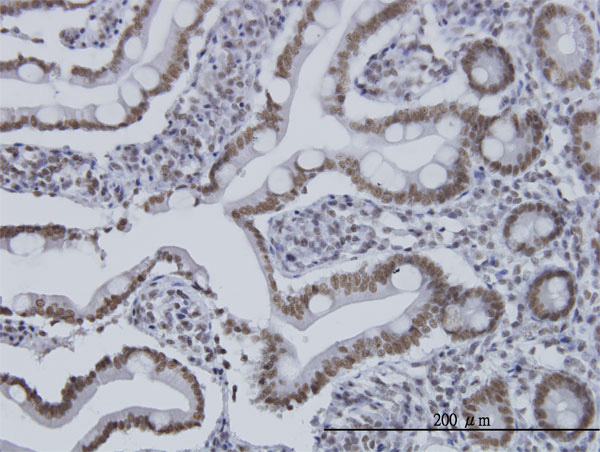 Immunoperoxidase of monoclonal antibody to HDAC1 on formalin-fixed paraffin-embedded human small Intestine. [antibody concentration 0.7 ug/ml] |