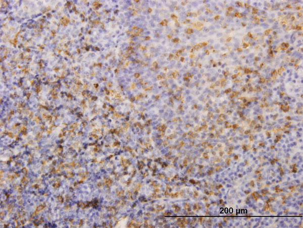 Immunoperoxidase of monoclonal antibody to HLA-DRB4 on formalin-fixed paraffin-embedded human tonsil. [antibody concentration 1 ug/ml] |