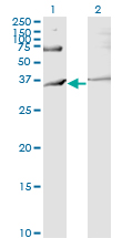 Western Blot analysis of RNF144B expression in transfected 293T cell line by IBRDC2 monoclonal antibody (M02), clone 4F1.Lane 1: RNF144B transfected lysate(33.6 KDa).Lane 2: Non-transfected lysate.