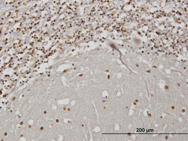 Immunoperoxidase of monoclonal antibody to IBRDC2 on formalin-fixed paraffin-embedded human cerebellum. [antibody concentration 1.2 ug/ml] |
