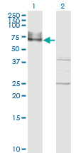 Western Blot analysis of ICAM1 expression in transfected 293T cell line by ICAM1 monoclonal antibody (M01), clone 3H8-2G6.Lane 1: ICAM1 transfected lysate (Predicted MW: 57.8 KDa).Lane 2: Non-transfected lysate.