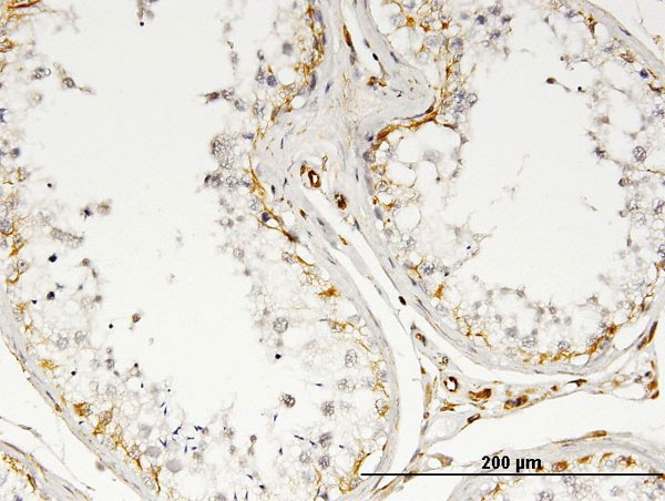 Immunoperoxidase of monoclonal antibody to IL13 on formalin-fixed paraffin-embedded human testis. [antibody concentration 3 ug/ml] |