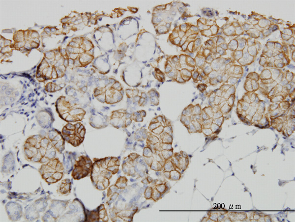 Immunoperoxidase of monoclonal antibody to IQGAP1 on formalin-fixed paraffin-embedded human salivary gland. [antibody concentration 1 ug/ml] |