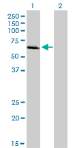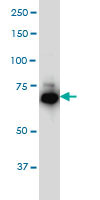 Western Blot analysis of IRAK1 expression in transfected 293T cell line by IRAK1 monoclonal antibody (M02), clone 3A9.Lane 1: IRAK1 transfected lysate(68 KDa).Lane 2: Non-transfected lysate. |