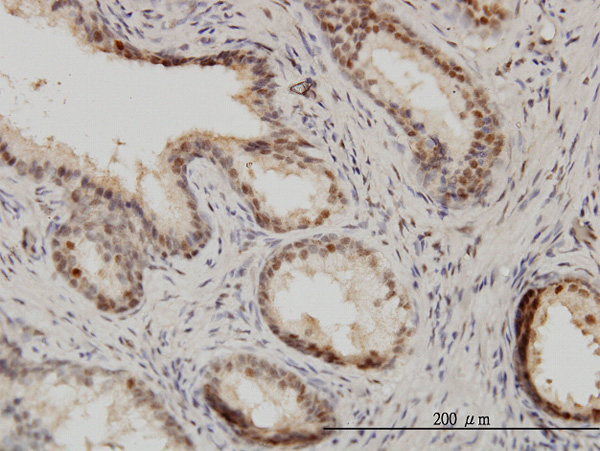 Immunoperoxidase of monoclonal antibody to ISGF3G on formalin-fixed paraffin-embedded human prostate. [antibody concentration 3 ug/ml]