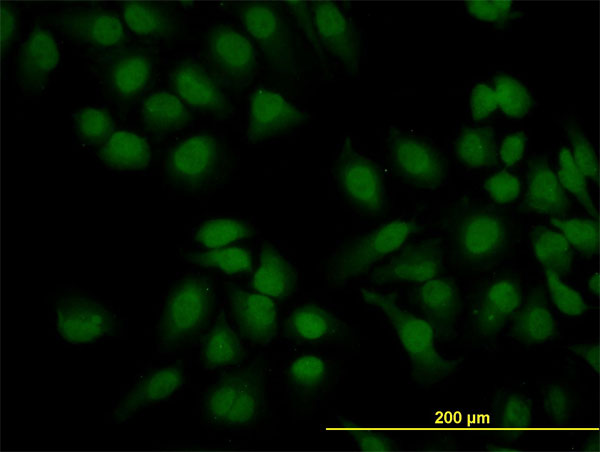 Immunofluorescence of monoclonal antibody to KIAA2002 on HeLa cell. [antibody concentration 10 ug/ml] |