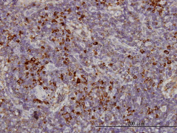 Immunoperoxidase of monoclonal antibody to KIFC1 on formalin-fixed paraffin-embedded human lymph node. [antibody concentration 3 ug/ml]