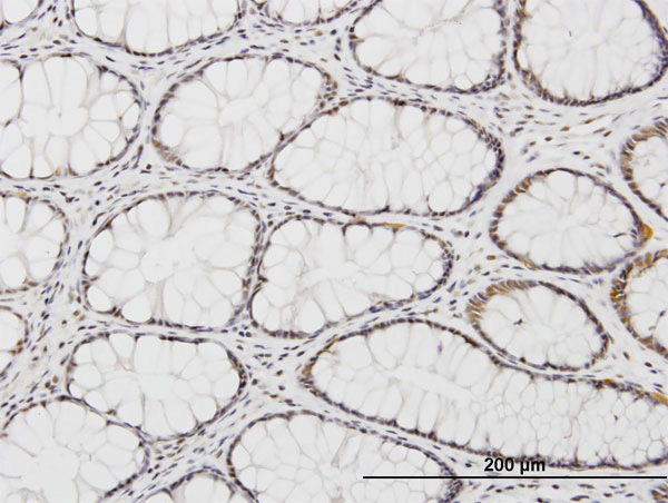 Immunoperoxidase of monoclonal antibody to KLF11 on formalin-fixed paraffin-embedded human colon. [antibody concentration 3 ug/ml] |
