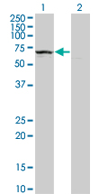 Western Blot analysis of KLHDC4 expression in transfected 293T cell line by KLHDC4 monoclonal antibody (M02), clone 4G11.Lane 1: KLHDC4 transfected lysate(57.9 KDa).Lane 2: Non-transfected lysate.