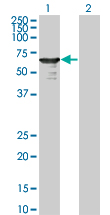 Western Blot analysis of L3MBTL4 expression in transfected 293T cell line by L3MBTL4 monoclonal antibody (M01), clone 1B9-1C12.Lane 1: L3MBTL4 transfected lysate(61.3 KDa).Lane 2: Non-transfected lysate. |