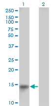 Western Blot analysis of LRRC8D expression in transfected 293T cell line by LRRC5 monoclonal antibody (M01), clone 3H1-1C2.Lane 1: LRRC8D transfected lysate(16 KDa).Lane 2: Non-transfected lysate.