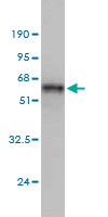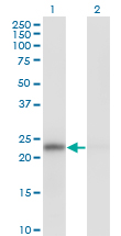 Western Blot analysis of MAD2L1 expression in transfected 293T cell line by MAD2L1 monoclonal antibody (M01), clone 2E2-1D6.Lane 1: MAD2L1 transfected lysate(23.5 KDa).Lane 2: Non-transfected lysate. |