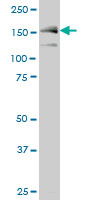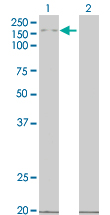Western Blot analysis of MAP3K5 expression in transfected 293T cell line by MAP3K5 monoclonal antibody (M03), clone 2D11.Lane 1: MAP3K5 transfected lysate(155 KDa).Lane 2: Non-transfected lysate. |