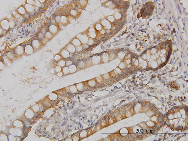 Immunoperoxidase of monoclonal antibody to MAPK13 on formalin-fixed paraffin-embedded human small Intestine. [antibody concentration 1 ug/ml] |