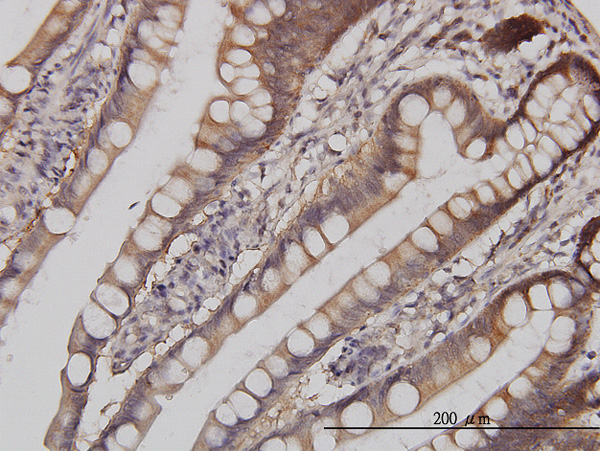Immunoperoxidase of monoclonal antibody to MAPK13 on formalin-fixed paraffin-embedded human small Intestine. [antibody concentration 1 ug/ml] |