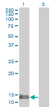 Western Blot analysis of MIF expression in transfected 293T cell line by MIF monoclonal antibody (M01), clone 2A10-4D3.Lane 1: MIF transfected lysate(12.5 KDa).Lane 2: Non-transfected lysate.