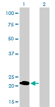 Western Blot analysis of MYL1 expression in transfected 293T cell line by MYL1 monoclonal antibody (M01), clone 2D9.Lane 1: MYL1 transfected lysate(21.1 KDa).Lane 2: Non-transfected lysate.