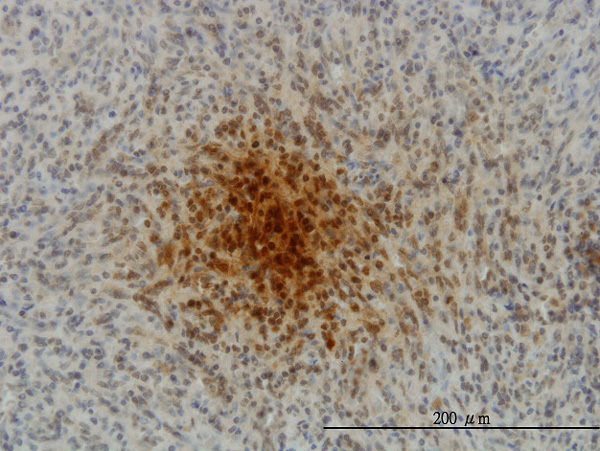 Immunoperoxidase of monoclonal antibody to MYL1 on formalin-fixed paraffin-embedded human spleen. [antibody concentration 3 ug/ml] |