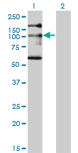 Western Blot analysis of NBR1 expression in transfected 293T cell line by NBR1 monoclonal antibody (M05), clone 5C3.Lane 1: NBR1 transfected lysate(107.4 KDa).Lane 2: Non-transfected lysate.