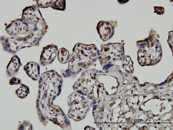 Immunoperoxidase of monoclonal antibody to NEDD1 on formalin-fixed paraffin-embedded human placenta. [antibody concentration 0.75 ug/ml]