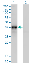 Western Blot analysis of NOV expression in transfected 293T cell line by NOV monoclonal antibody (M01), clone 3C2.Lane 1: NOV transfected lysate(39.2 KDa).Lane 2: Non-transfected lysate.