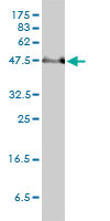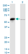 Western Blot analysis of SERBP1 expression in transfected 293T cell line by PAI-RBP1 monoclonal antibody (M01), clone 1D2-2E9.Lane 1: SERBP1 transfected lysate(45 KDa).Lane 2: Non-transfected lysate. |