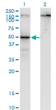 Western Blot analysis of PARD6B expression in transfected 293T cell line by PARD6B monoclonal antibody (M01), clone 1C4.Lane 1: PARD6B transfected lysate(41.2 KDa).Lane 2: Non-transfected lysate.