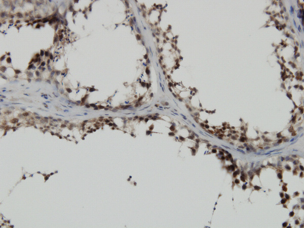 Immunoperoxidase of monoclonal antibody to PBK on formalin-fixed paraffin-embedded human testis. [antibody concentration 3 ug/ml] |