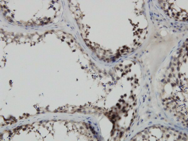 Immunoperoxidase of monoclonal antibody to PBK on formalin-fixed paraffin-embedded human testis. [antibody concentration 3 ug/ml] |