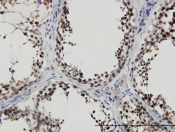 Immunoperoxidase of monoclonal antibody to PBK on formalin-fixed paraffin-embedded human testis. [antibody concentration 3 ug/ml] |