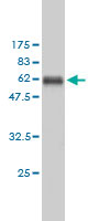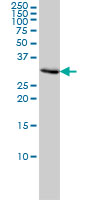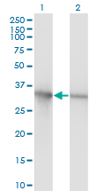 Western Blot analysis of PCNA expression in transfected 293T cell line by PCNA monoclonal antibody (M02), clone 1G7.Lane 1: PCNA transfected lysate(28.8 KDa).Lane 2: Non-transfected lysate. |
