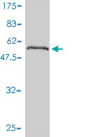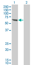 Western Blot analysis of PPM1B expression in transfected 293T cell line by PPM1B monoclonal antibody (M01), clone 1A3-2A4.Lane 1: PPM1B transfected lysate(52.643 KDa).Lane 2: Non-transfected lysate.