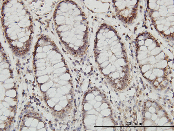 Immunoperoxidase of monoclonal antibody to PSMB8 on formalin-fixed paraffin-embedded human colon. [antibody concentration 3 ug/ml] |