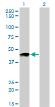 Western Blot analysis of PTGIR expression in transfected 293T cell line by PTGIR monoclonal antibody (M01), clone 4B10.Lane 1: PTGIR transfected lysate(41 KDa).Lane 2: Non-transfected lysate. |