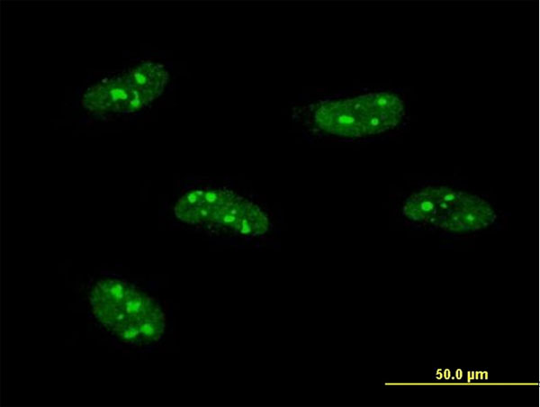 Immunofluorescence of monoclonal antibody to PWP1 on HeLa cell . [antibody concentration 10 ug/ml] |