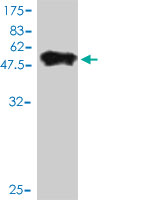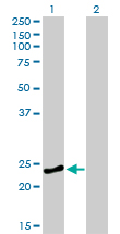 Western Blot analysis of RAB4A expression in transfected 293T cell line by RAB4A monoclonal antibody (M01), clone 1C10.Lane 1: RAB4A transfected lysate(24.4 KDa).Lane 2: Non-transfected lysate. |