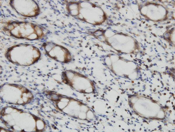 Immunoperoxidase of monoclonal antibody to RALB on formalin-fixed paraffin-embedded human colon. [antibody concentration 3 ug/ml] |