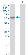 Western Blot analysis of RANBP3 expression in transfected 293T cell line by RANBP3 monoclonal antibody (M01), clone 2E10.Lane 1: RANBP3 transfected lysate(42.4 KDa).Lane 2: Non-transfected lysate.