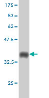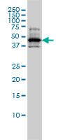Western Blot analysis of RCC1 expression in transfected 293T cell line by RCC1 monoclonal antibody (M01), clone 2F1.Lane 1: RCC1 transfected lysate(45 KDa).Lane 2: Non-transfected lysate. |