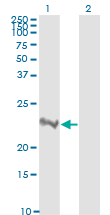 Western Blot analysis of RHOA expression in transfected 293T cell line by RHOA monoclonal antibody (M04), clone 1B12.Lane 1: RHOA transfected lysate(21.8 KDa).Lane 2: Non-transfected lysate. |
