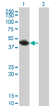 Western Blot analysis of RNF133 expression in transfected 293T cell line by RNF133 monoclonal antibody (M01), clone 3D6.Lane 1: RNF133 transfected lysate(42.3 KDa).Lane 2: Non-transfected lysate.