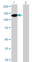 Western Blot analysis of RNF40 expression in transfected 293T cell line by RNF40 monoclonal antibody (M09), clone 1C1.Lane 1: RNF40 transfected lysate(113.7 KDa).Lane 2: Non-transfected lysate.