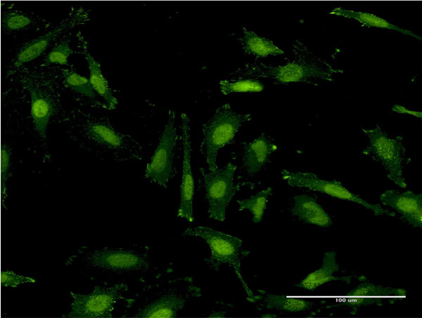Immunofluorescence of monoclonal antibody to RNF40 on HeLa cell . [antibody concentration 10 ug/ml] |