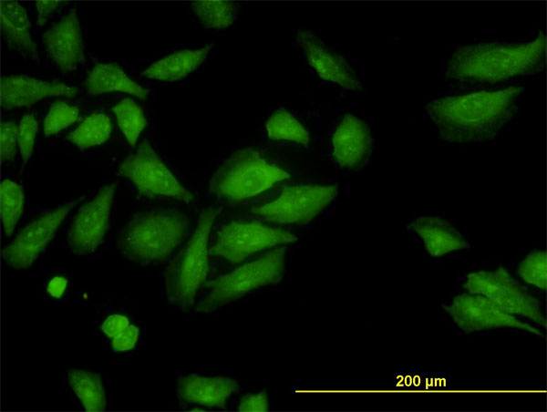 Immunofluorescence of monoclonal antibody to ROCK2 on HeLa cell. [antibody concentration 10 ug/ml] |