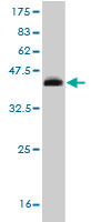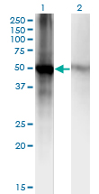 Western Blot analysis of RORB expression in transfected 293T cell line by RORB monoclonal antibody (M08), clone 1E5.Lane 1: RORB transfected lysate (Predicted MW: 52.1 KDa).Lane 2: Non-transfected lysate.